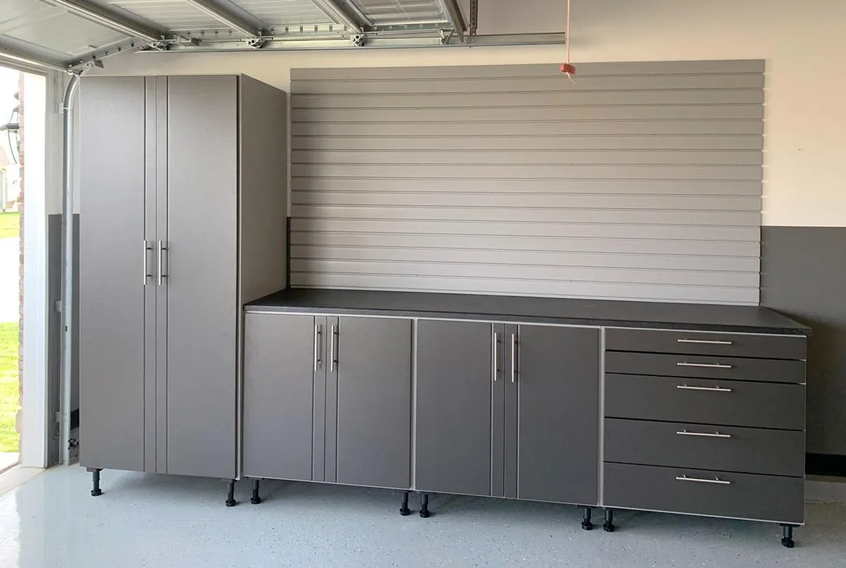 Slatwall and overhead storage solutions help keep your garage organized by utilizing vertical and ceiling space for easy access and clutter-free storage.